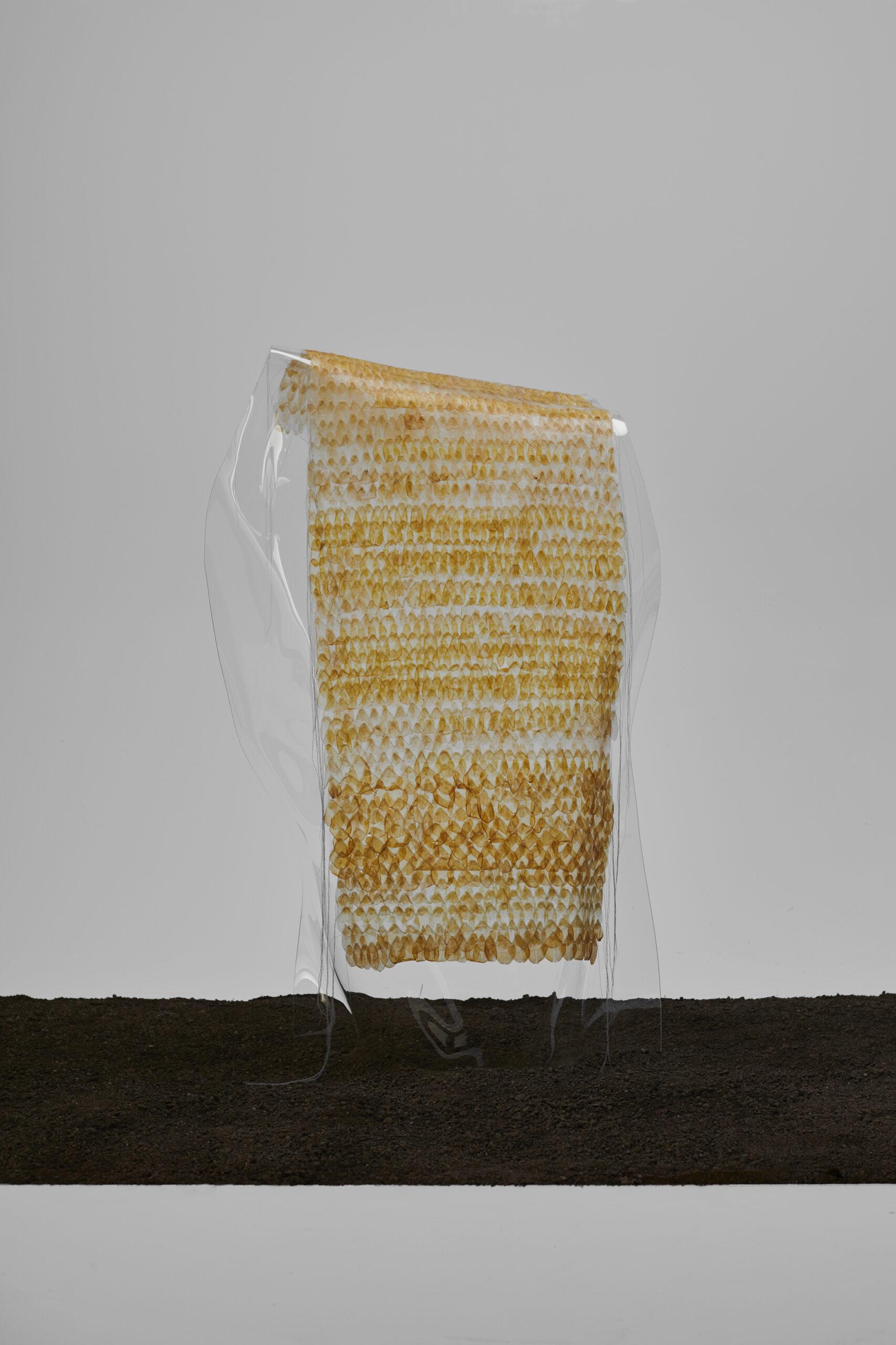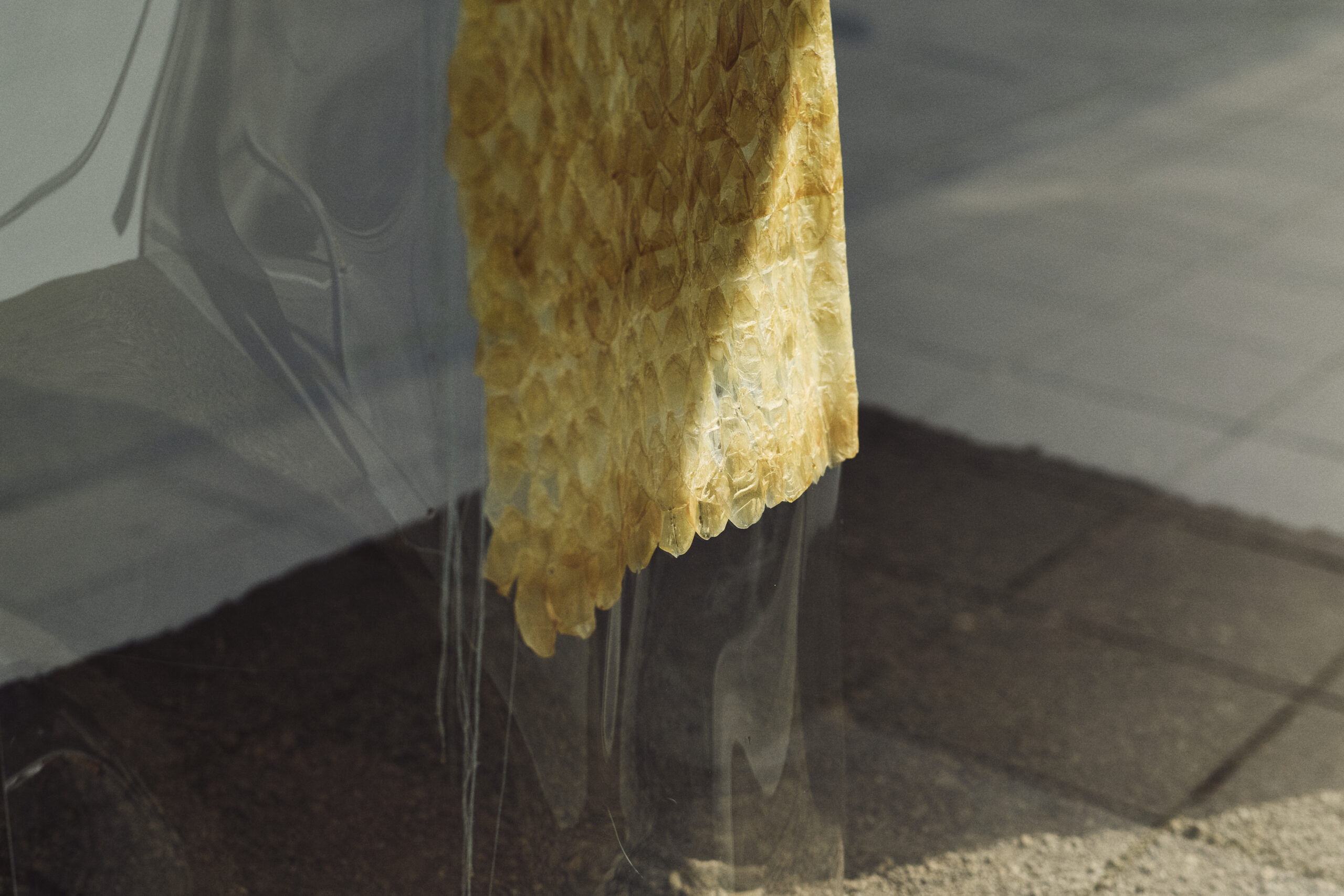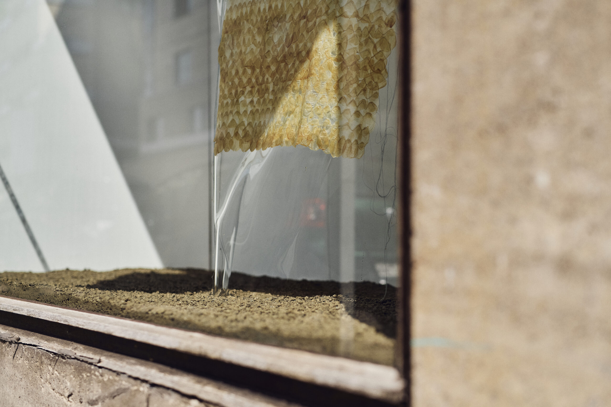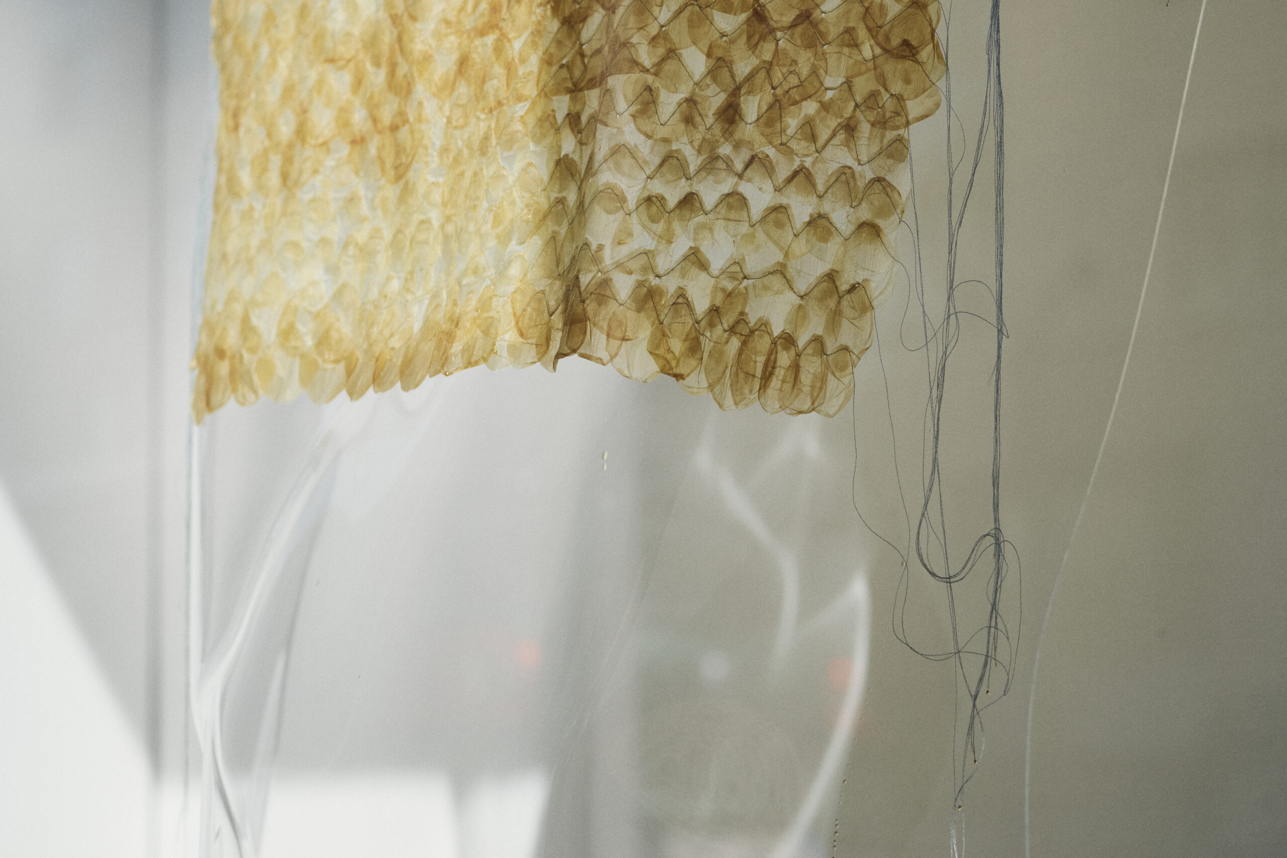The fluid forms of the transparent triptych carry the seemingly floating petal-membrane, which lingers on the repertoire of forms. Reflections of light immanently oscillate on the smooth surface and depict the presence of the ephemeral. The pliant petal-veil already bears the traces of its end. In the dialogue between the fragility of the blossom and the stability of the seam, both the past and the passing – as well as the attempt to hold on to it – are called into question. Firmly rooted in the earth, the work balances growth and creation in the rhythm of becoming and vanishing.
